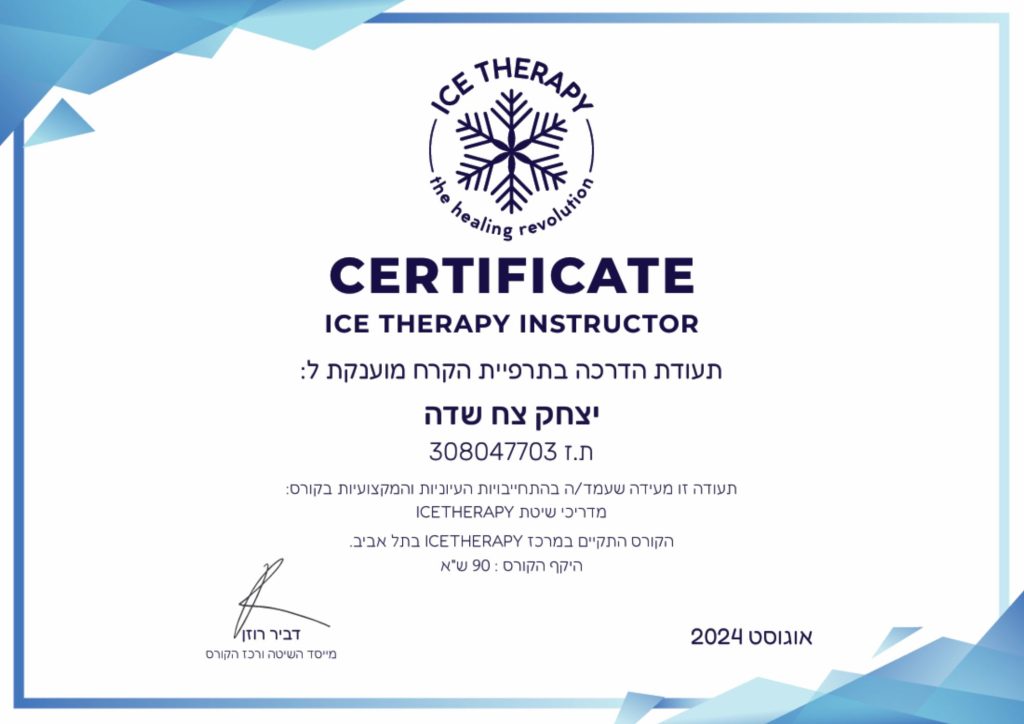 אני מדריך Ice Therapy – גישה אישית שמבוססת על העקרונות של שיטת Wim Hof, תוך התאמה אישית לתהליך הריפוי, הקשב והנוכחות של כל אדם. השיטה כוללת חשיפה למים קרים ככלי לחיזוק הגוף, חידוד הנפש ופתיחת הלב.